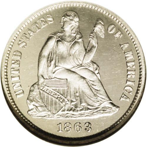 <B>1863<10C> PR67 Ultra Cameo NGC.</B></I> Fortin-101. The mintage of this date was limited to just 14,000 business strikes and 460 proofs. All of those coins were from a single die pair in two different die states. Although business strikes are clearly more popular with advanced specialists than are proofs, it would be hard to find the aesthetic appeal of this Superb example undesirable. Both sides are fully brilliant with amazing contrast. The devices are brilliant with frosty silver luster, and the fields are deeply mirrored. The overall appearance is exceptional. This is tied with one other coin as the finest Ultra Cameo proof example certified by NGC.