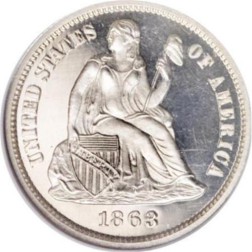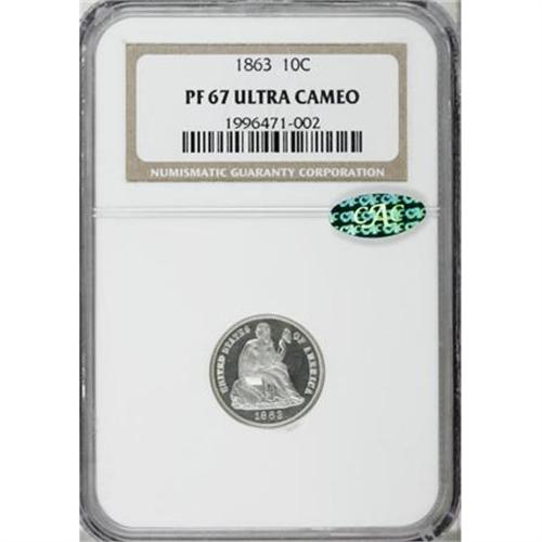 <B>1863 10C PR67 Ultra Cameo NGC.</B></I> Fortin-101. The mintage of this date was limited to just 14,000 business strikes and 460 proofs. All of those coins were from a single die pair in two different die states. Although business strikes are clearly more popular with advanced specialists than are proofs, it would be hard to find the aesthetic appeal of this Superb Gem example undesirable. Both sides are fully brilliant with amazing contrast. The devices are brilliant with frosty silver luster, and the fields are deeply mirrored. The overall appearance is exceptional. This is tied with one other coin as the finest Ultra Cameo proof example certified by NGC.<BR><BR><b>Shipping:</b> Coins & Currency (<a target="_blank" href="http://www.heritageauctions.com/common/shipping.php">view shipping information</a>)