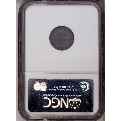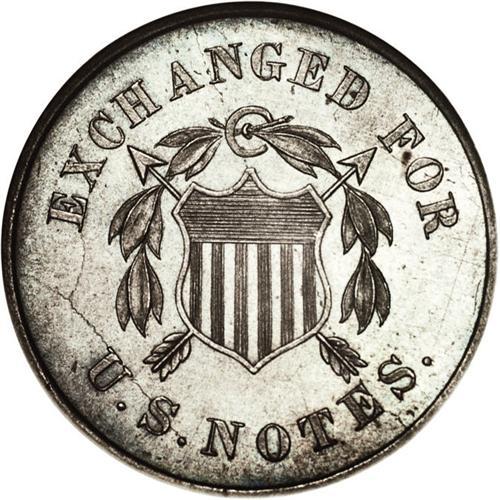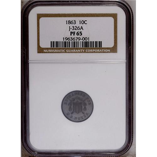 <B>1863 10C Ten Cents, Judd-326A, Pollock-394, High R.6, PR65 NGC.</B></I> During the Civil War, coins were hoarded by both North and South, and this pattern was part of an effort to replenish small change. This problem was eventually solved by fractional currency. The obverse features an ornamental shield with an inverted laurel wreath suspended from a ring. A pair of crossed arrows is behind the shield. The peripheral legend reads EXCHANGED FOR U.S. NOTES. The reverse has 10 CENTS 1863 in the center and * POSTAGE CURRENCY * ACT JULY 1862 around the margin. These dies were stuck in various alloys. Judd-326A was struck with a plain edge in a billion copper-silver alloy. Deeply toned in blended cobalt-blue and russet colors, this fully struck example is disturbed by only a few faint obverse hairlines.