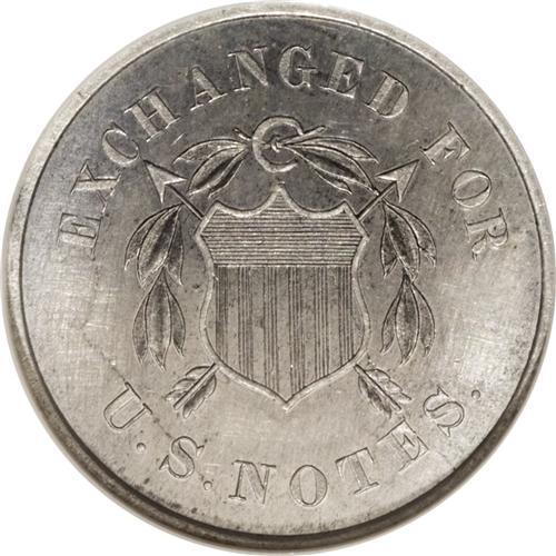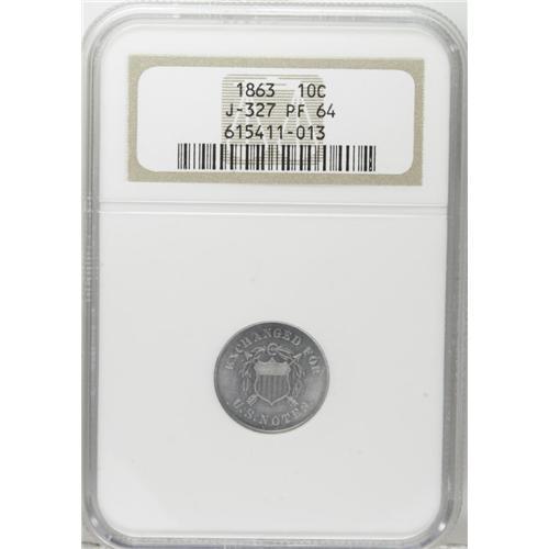 <B>1863 10C Ten Cents, Judd-327, Pollock-397, High R.6, PR64 NGC.</B></I> The obverse shows two arrows piercing a Union shield; a simple wreath lies above. Tokenlike legends constitute the rest of the design: EXCHANGED FOR U.S. NOTES on the obverse, POSTAL CURRENCY ACT JULY 1862 and 10 CENTS 1863 on the reverse. Struck in aluminum with a plain edge, this pattern represents an early attempt to replace the fractional currency in circulation. Numerous obverse die cracks are seen, but otherwise only a bit of smoke-gray toning is noted.<BR><BR><b>Shipping:</b> Coin/Currency (<a target="_blank" href="http://www.heritageauctions.com/common/shipping.php">view shipping information</a>)