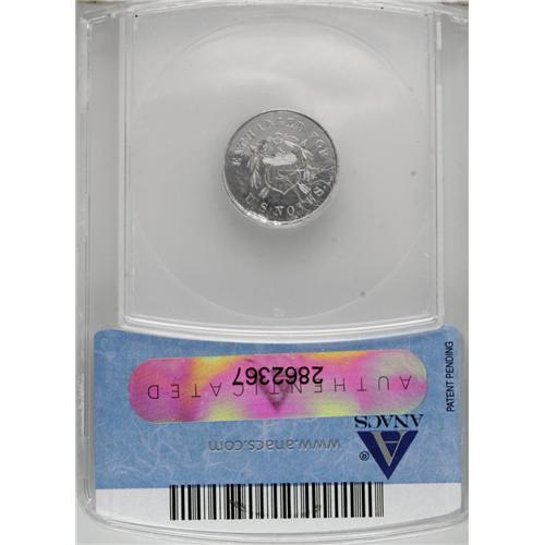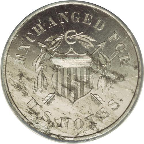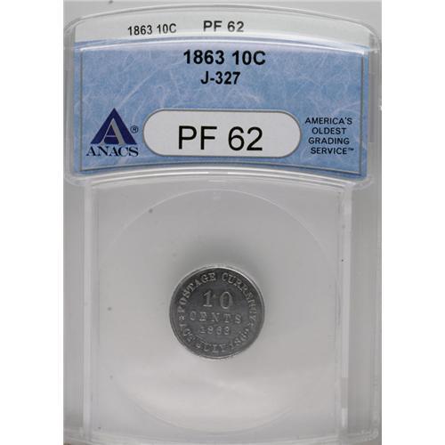 <B>1863 10C Ten Cents, Judd-327, Pollock-397, High R.6, PR62 ANACS.</B></I> The obverse depicts a Union shield pierced by two arrows, a simple wreath rests above. The remainder of the design consists of token-like legends; EXCHANGED FOR U.S. NOTES on the obverse, POSTAL CURRENCY ACT JULY 1862 and 10 CENTS 1863 on the reverse. Struck in aluminum with a plain edge. An early attempt to replace the despised fractional currency pieces in circulation; the two cent piece, three cent nickel, and shield nickel were eventually introduced for this purpose. Brilliant and well centered, but limited in grade by both squiggly lint marks and spotty grease stains that were both struck into the obverse at the time of manufacture. Apparently, little care was taken when this pattern piece was produced.<BR> These patterns have been extensively studied and book has been published about them by David Cassel. As he points out regarding the Judd-327 and 328, there are oddball varieties of metal that were used for alloying that have never been listed, such as iron, silicon, lead, and possibly cobalt and bismuth. This piece would certainly provide ample opportunity for study should the new owner wish to pursue metallurgical testing.<BR><BR><b>Shipping:</b> Coins & Currency (<a target="_blank" href="http://www.heritageauctions.com/common/shipping.php">view shipping information</a>)
