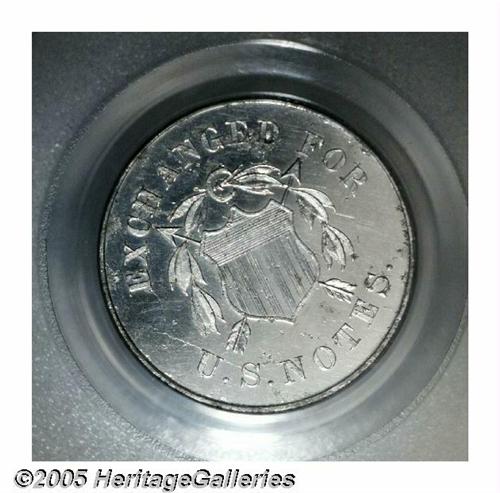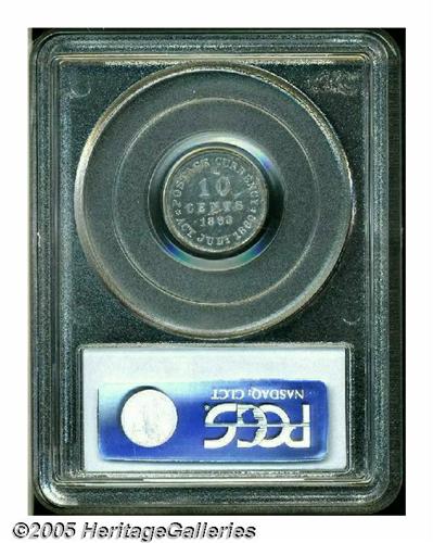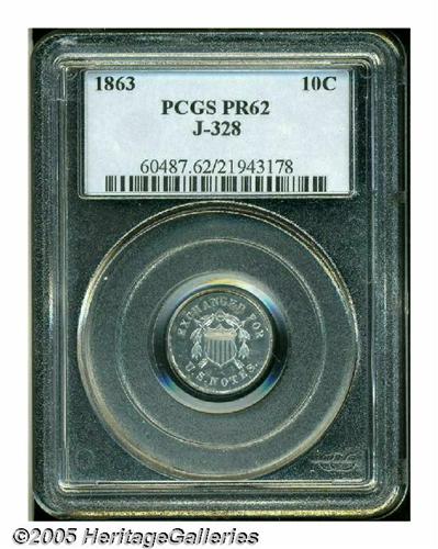 <B>1863 10C Ten Cents, Judd-328, Pollock-398, R.7, PR 62 PCGS.</B></I> 10.95 grains. The same design, and even more specifically, the same dies used to strike the aforementioned pattern were used to strike this specimen. For the number of pieces struck from this set of dies, the die crack mentioned in the U and S of U.S. NOTES has traveled further, arcing from the rim at 7 o'clock through U.S. to 9 o'clock. An even larger die crack bisects the reverse from 3 o'clock to 8 o'clock.<BR>Previously mentioned in the Stack's September 1987 Sale, the piece was struck in an alloy that is comprised of 97% aluminum and 3% silver and has a reeded edge. Aside from some porosity in the aluminum, this is a boldly struck specimen with nice, watery fields.