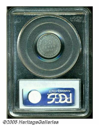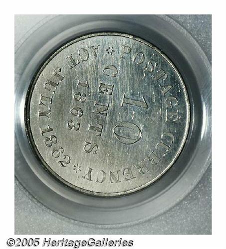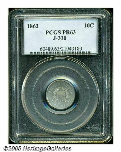 <B>1863 10C Ten Cents, Judd-330, Pollock-399, R.6, PR63 PCGS.</B></I> Struck in either tin or a tin/copper alloy with a plain edge. This fascinating series has been exhaustively studied by David Cassel, who published a book on Postage Currency patterns a couple of years ago. Brilliant-gray throughout, the surfaces on this piece display an interesting bright appearance and the planchet appears to have buckled slightly from die ejection.