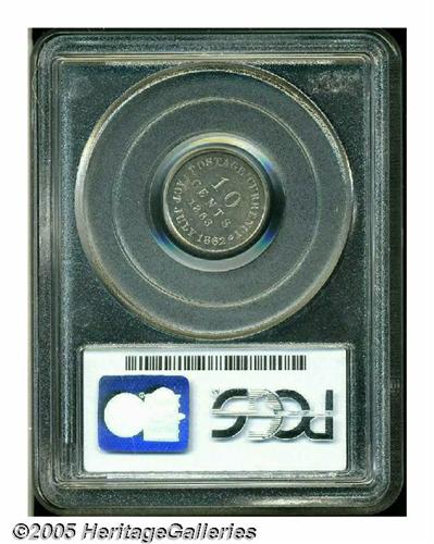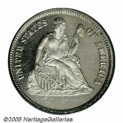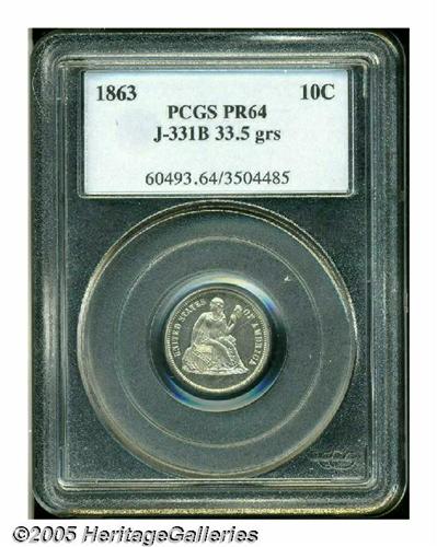 <B>1863 10C Ten Cents, Judd-331B, Pollock-402, R-7, PR64 PCGS.</B></I> This attractive near-Gem specimen last appeared in our January 2000 F.U.N. Signature Sale where it was described, "33.5 grains. A SEM-EDX analysis (#3504485) was performed, indicating the coin is composed of 75.2% copper and 24.8% nickel. The design is a dateless Seated Liberty obverse, paired with the proposed postage currency reverse featuring 10 CENTS 1863 in the center and * POSTAGE CURRENCY *ACT JULY 1862 around the margin. Struck with a reeded edge.<BR>The obverse was created in 1836 by Christian Gobrecht and redesigned in 1859 by James B. Longacre, and the reverse also designed in 1859 by James B. Longacre. Five reeded edge coins of this design are known. The dateless Seated Liberty obverse die was created during the transition period of 1859-1860 and paired with the Postage Currency reverse. Note the broken S serif of the first S in STATES. This imperfect die was set aside and a second imperfect die was fashioned. The third die was what may be referred to as the "perfect" die. The perfect die was put into service and used by the Mint for several years. The imperfect dies were not destroyed but were kept in the coiner's humid vault and were unprotected against rusting. Special dies, like the dies for the 1804 dollar were boxed in lard and carefully stored in the Mint Director's vault. In May, 1863 the die with the broken S was removed from the coiner's vault and used to create five fantasy pieces of the die combination seen here. One copper, Judd-331a, piece was struck and four cupro-nickel coins of varying weights and metals were also produced. According to Mr. Wolfe, this pattern, as well as Judd-641 and 642, were struck in 1869. This assertion will be proved in a future article to be published by Mr. Wolfe. He voluntarily informed Abe Kosoff about the coins in his collection and Kosoff noted them in</B></I><I> United States Pattern, Experimental and Trial Pieces</B></I> (6th and 7th editions), where the name G. H. Wolfe is seen alongside the Judd-331B and other issues. The Judd-331 coin pictured in the Judd reference is the coin that today resides in the Harry W. Bass Foundation Collection.<BR>The coin itself is brightly mirrored and shows only the vaguest suggestion of light color on each side. Heavy die striations are located in the upper obverse field, a trait common to all patterns struck from this obverse die."<BR><I>Mr. Wolfe acquired this coin from Liberty Coin Co. in 1974. He performed a specific gravity test analysis with the result of 8.93. Another example of the J-331B pattern may be found in The Harry W. Bass Foundation Collection.</B></I>