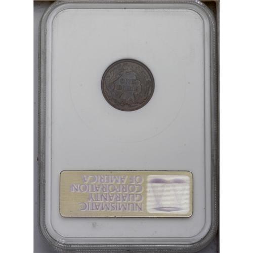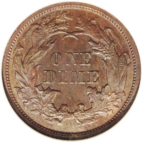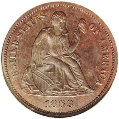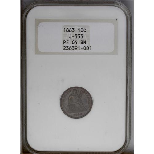 <B>1863<10C> Ten Cents, Judd-333, Pollock-405, Low R.7, PR64 Brown NGC.</B></I> Regular die trials striking of the dime. Believed to be restrikes. Struck in copper with a reeded edge. The USPatterns.com website provides interesting background information and solves the mystery of these pieces: "Although described as regular dies trial pieces in the literature, this is actually a backdated fantasy piece made to complete off-metal sets of this year which included the quarter, half and dollar with the motto 'In God We Trust' used on regular coinage from 1866 to 1891. This was actually made sometime between 1869 and 1875. This piece was made from the 1869 hub having broken 'S' in States and from an 1869 reverse hub with the die scratch angling upwards from the right wreath into the center." Deep brown patina covers each side, and the only mark of note is a horizontal tick across the face of Liberty. Sharply struck on the obverse with weak definition on the wreath on the reverse. <BR><BR><B>Important notice:</B> Heritage usually auctions material at the rate of 200-250 lots per hour. On some occasions eBay Live bid software or the Internet may not be able to keep up with the pace of the auction. We recommend placing a realistic absentee bid now as insurance to avoid disappointment. Occasionally the auctioneer may eliminate or reject an eBay Live bid, and the auctioneer may also reopen a lot after the close of the eBay live bidding (usually because we missed an audience bid), and may reject your bid even if it shows you as the winning bidder. By bidding via eBay Live, you agree that Heritage may award the lot to another bidder at its sole discretion under the circumstances described above or any other reasonable circumstances. Since eBay bids are not shown to us until we open the lot on the floor, we treat those bids just like floor bids. In most cases the floor responds before the eBay bid is presented to us, due to Internet lag time, so for consistency we have made it a policy that floor bids are always considered first over tie eBay live bids. Also please note that all Heritage lots purchased through eBay Live carry a 20% Buyer's Premium. Please make sure you read the Terms and Conditions before you bid. This lot is being auctioned in conjunction with a live floor auction by Heritage Galleries & Auctioneers. All final auction and invoice information will be supplied by Heritage Galleries & Auctioneers, and all other information should be considered preliminary. Lot:1824 <BR><BR><B>Winning Notification and Billing:</B> After the FINAL session in this auction is complete, Heritage will send e-mail and snail mail invoices. This process normally takes several days. All final auction and invoice information will be supplied by Heritage Galleries & Auctioneers, and all other information should be considered preliminary. <BR><BR>This auction will be conducted on a live auction floor and over the Internet through eBay Live. If you choose to place an absentee bid, please take a moment to <font color='#0000ff'><u><a href='http://pages.ebay.com/liveauctions/help/before/laabsentee.html'>learn how eBay Live absentee bidding works</a></u></font><font color='#000000'>