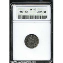 <TABLE cellSpacing=0 cellPadding=0 width="100%" bgColor=#000000 border=0><TBODY><TR><TD width="100%"><TABLE cellSpacing=1 cellPadding=3 width="100%" border=0><TBODY><TR><TD width="100%" bgColor=#79735c><FONT face=arial color=#ffffff size=3><B>Description</B> </FONT></TD></TR><TR><TD width="100%" bgColor=#ffffff><FONT face=arial size=2><B>1863 10C XF40 ANACS.</B></I> Freckles of aqua-marine and tan patina outline the untoned devices. LIBERTY is bold, and the surfaces are relatively unmarked. A mere 14,000 pieces were struck.<BR><I>From The V. Michael Collection, Part I.</B></I> </FONT></TD></TR></TBODY></TABLE></TD></TR></TBODY></TABLE><BR><A name=PricesRealized></A><TABLE cellSpacing=0 cellPadding=0 width="100%" bgColor=#000000 border=0><TBODY><TR><TD width="100%"><TABLE cellSpacing=1 cellPadding=3 width="100%" border=0><TBODY><TR><TD width="100%" bgColor=#79735c><A name=PR><FONT face=arial color=#ffffff size=3><B>Previous Prices from Heritage Auctions</B> </FONT></A></TD></TR><TR><TD bgColor=#f6f6ed>No Prior Data Recorded </TD></TR><TR><TD bgColor=#ffffff><FONT face=arial size=1 ?>PLEASE NOTE: All prices realized reflect the final hammer price PLUS the buyer's premium in auctions that charge a buyer's premium. Each item has a notation at the top of the listing indicating whether that lot included a buyer's premium. Example: A item that sells with a final hammer price of $100 and a 20% buyer's premium will display with a price realized of $120. All information listed is intended to be as accurate as possible, but errors are possible. Please use this guide carefully and inform us of any inaccuracies. </FONT></TD></TR></TBODY></TABLE></TD></TR></TBODY></TABLE><BR><TABLE cellSpacing=0 cellPadding=0 width="100%" bgColor=#000000 border=0><TBODY><TR><TD width="100%"><TABLE cellSpacing=1 cellPadding=3 width="100%" border=0><TBODY><TR><TD width="100%" bgColor=#79735c colSpan=6><FONT face=arial color=#ffffff size=3><B>Price Guide*</B> </FONT></TD></TR><TR bgColor=#f6f6ed><TD align=middle><B>Grade</B> </TD><TD align=middle><B>Coin World<BR>(Trends)</B> </TD><TD align=middle><B>Numismedia<BR>Retail</B> </TD><TD align=middle><B>Numismedia<BR>Wholesale</B> </TD><TD align=middle><B>Coin<BR>Universe</B> </TD><TD align=middle><B>Heritage<BR>Value Index</B> </TD></TR><TR bgColor=#ffffff><TD align=middle>35</TD><TD align=right>---</TD><TD align=right>---</TD><TD align=right>---</TD><TD align=right>---</TD><TD align=right>$444.67</TD></TR><TR style="FONT-WEIGHT: bold" bgColor=#cccfdd><TD align=middle>40</TD><TD align=right>$700.00</TD><TD align=right>$720.00</TD><TD align=right>$600.00</TD><TD align=right>$555.00</TD><TD align=right>$462.33</TD></TR><TR bgColor=#ffffff><TD align=middle>45</TD><TD align=right>---</TD><TD align=right>---</TD><TD align=right>---</TD><TD align=right>---</TD><TD align=right>$485.14</TD></TR><TR bgColor=#ffffff><TD colSpan=6><FONT size=1>*All information listed is intended to be as accurate as possible, but errors are possible. No item may be returned or refused based on this information which is provided as a service to our customers. You should contact each pricing source directly to determine the accuracy of this information. </FONT></TD></TR></TBODY></TABLE></TD></TR></TBODY></TABLE><BR><TABLE cellSpacing=0 cellPadding=0 width="100%" bgColor=#000000 border=0><TBODY><TR><TD width="100%"><TABLE cellSpacing=1 cellPadding=3 width="100%" border=0><TBODY><TR><TD width="100%" bgColor=#79735c><FONT face=arial color=#ffffff size=3><B>Population Guide</B> </FONT></TD></TR><TR bgColor=#ffffff><TD align=middle><!-- Begin Output of Population Grid--><TABLE cellSpacing=0 cellPadding=0 width="100%" border=0><TBODY><TR><TD vAlign=center><TABLE cellSpacing=0 width="100%" border=1 cellsadding="3"><TBODY><TR><TD vAlign=center><TABLE cellSpacing=0 cellPadding=3 width="100%" border=1><TBODY><TR><TD vAlign=center align=middle bgColor=#f0f1e8 colSpan=2 <CENTER><FONT face=Arial size=2><B>PCGS Pop </B></FONT><CENTER></CENTER></TD><TD vAlign=center align=middle bgColor=#f0f1e8 colSpan=2><CENTER><FONT face=Arial size=2><B>NGC Pop</B></CENTER></FONT></TD></TR><TR><TD vAlign=center><FONT face=Arial size=2>(40)</FONT> </TD><TD vAlign=center align=right><FONT face=Arial size=2>0</FONT> </TD><TD vAlign=center><FONT face=Arial size=2>(40)</FONT> </TD><TD vAlign=center align=right><FONT face=Arial size=2>0</FONT> </TD></TR><TR><TD vAlign=center><FONT face=Arial size=2>(>40)</FONT> </TD><TD vAlign=center align=right><FONT face=Arial size=2>30</FONT> </TD><TD vAlign=center><FONT face=Arial size=2>(>40)</FONT> </TD><TD vAlign=center align=right><FONT face=Arial size=2>31</FONT> </TD></TR></TBODY></TABLE></TD></TR></TBODY></TABLE></TD></TR></TBODY></TABLE><!-- End Output of Population Grid--> Important notice: Heritage usually auctions material at the rate of 200-250 lots per hour. On some occasions eBay Live bid software or the Internet may not be able to keep up with the pace of the auction. We recommend placing a realistic absentee bid now as insurance to avoid disappointment. Occasionally the auctioneer may eliminate or reject an eBay Live bid, and the auctioneer may also reopen a lot after the close of the eBay live bidding (usually because we missed an audience bid), and may reject your bid even if it shows you as the winning bidder. By bidding via eBay Live, you agree that Heritage may award the lot to another bidder at its sole discretion under the circumstances described above or any other reasonable circumstances. Also please note that all Heritage lots purchased through eBay Live carry a 20% Buyer's Premium. Please make sure you read the Terms and Conditions before you bid.</TD></TR></TBODY></TABLE></TD></TR></TBODY></TABLE>