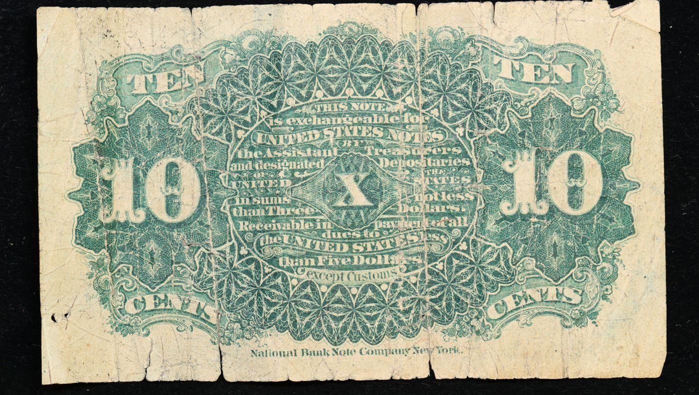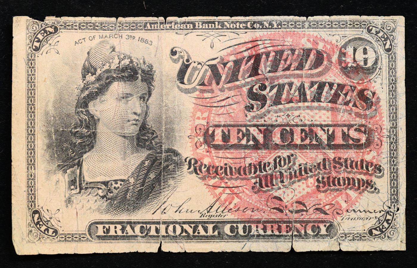 1863 10c Fractional Currency, Fourth Issue Grades vf++. Fractional or postage currency has a rich history. At the beginning of the Civil War people starting hoarding coins for their precious metal content. Coins became difficult to find because of the hoarding. People started to try to use stamps instead of coins as a means of commerce. The government decided to help ease the hoarding issue by issuing “paper coins” also known as postage currency or fractional currency. Fractional currency was first issued on August 21, 1862 and they were last issued on February 15, 1876. Three cents, five cents, ten cents, twenty-five cents, and fifty cents notes were all issued. Fractional currency is physically smaller than other United States money. It also does not have a serial number. William Meredith is pictured on the front.