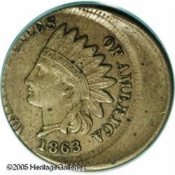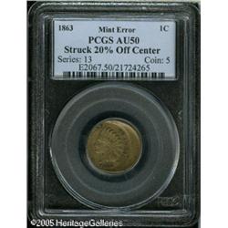<B>1863 1C Indian Cent--Struck 20% Off Center--AU50 PCGS.</B></I> Struck off center at 9 o'clock. Pale tan with hints of blue toning. An attractive example.<BR><I>From The Larry Rausch Collection, Part Three.</B></I> Lot:10823