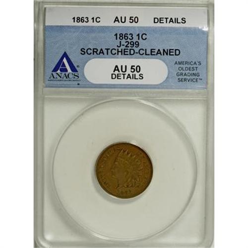 <B>1863 1C One Cent, Judd-299, Pollock-359, R.3--Scratched, Cleaned--ANACS. AU50 Details.</B></I> Snow-PT1. A transitional variety; similar to the 1864 No L bronze cent but dated 1863, when all regular issue cents were copper-nickel. Struck in bronze with a plain edge. Medallic alignment of the dies. This chocolate-brown pattern has little evidence of friction, but numerous wispy hair-thin marks are noted beneath the patina.<BR><BR><b>Shipping:</b> Coins & Currency (<a target="_blank" href="http://www.heritageauctions.com/common/shipping.php">view shipping information</a>)