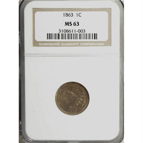 <B>1863 1C MS63 NGC.</B></I> NGC Census: (373/718). PCGS Population (582/730). Mintage: 49,840,000. Numismedia Wsl. Price for NGC/PCGS coin in MS63: $150. (#2067)<BR><BR><B>Coin Engraver:</B> James B. Longacre<BR><BR><b>Shipping:</b> Coins & Currency (<a target="_blank" href="http://www.heritageauctions.com/common/shipping.php">view shipping information</a>)
