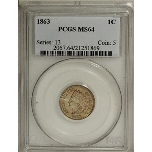 <B>1863 1C MS64 PCGS.</B></I> . PCGS Population (568/165). NGC Census: (528/192). Mintage: 49,840,000. Numismedia Wsl. Price for NGC/PCGS coin in MS64: $285. (#2067)<BR><BR><B>Coin Engraver:</B> James B. Longacre<BR><BR><b>Shipping:</b> Coins & Currency (<a target="_blank" href="http://www.heritageauctions.com/common/shipping.php">view shipping information</a>)