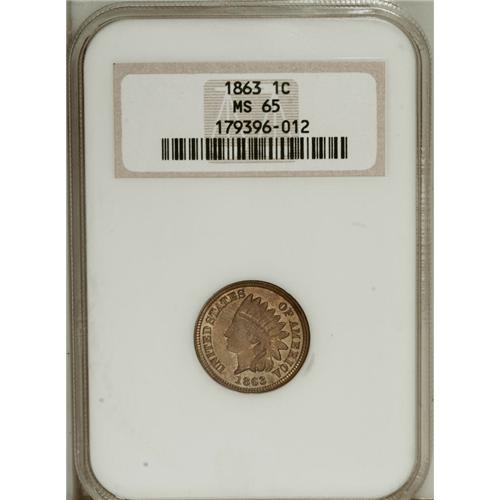 <B>1863<1C> MS65 NGC.</B></I> Masterfully struck and well preserved throughout with evidence of faint magenta and lime-green coloration in the upper obverse fields and along the wreath on the reverse. A high-end example that is worthy of premium bid consideration.