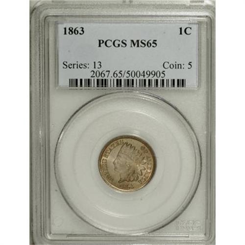 <B>1863 1C MS65 PCGS.</B></I> Boldly struck and lustrous, with pleasing light tan coloration and a blemish-free reverse. A couple of tiny nicks are observed on Liberty's face (with a magnifier), along with an interesting pebbly texture (as struck) on the neck. <BR><BR><b>Shipping:</b> Coins & Currency (<a target="_blank" href="http://www.heritageauctions.com/common/shipping.php">view shipping information</a>)