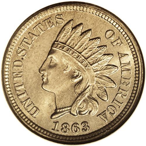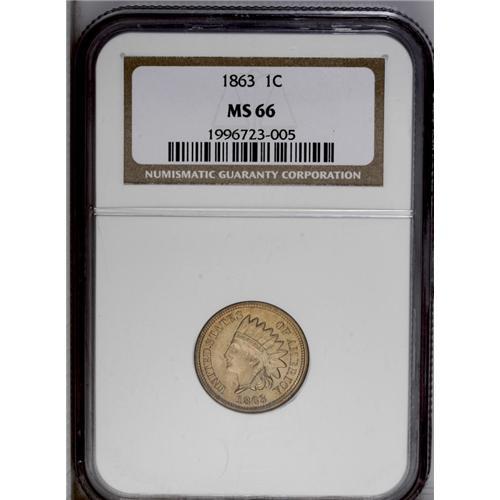 <B>1863<1C> MS66 NGC.</B></I> An exceedingly sharp example of this issue, one that is seldom found in a higher grade than the present example. Both sides boasts lovely, consistent reddish-copper surfaces, with a bold strike, save for the foremost headdress-feather tip. There is a small pinscratch above the date, visible under a loupe. Neither NGC nor PCGS has graded an example finer (7/06).