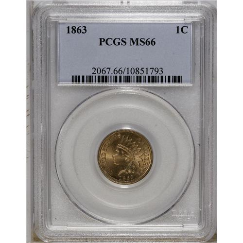 <B>1863 1C MS66 PCGS.</B></I> A crisply struck example with pleasing mahogany surfaces. Two trivial carbon spots appear on the obverse, one in the left field, the other below the lowest feather. Population: 25 in 66, 0 finer (10/06).<BR><BR><b>Shipping:</b> Coin/Currency (<a target="_blank" href="http://www.heritageauctions.com/common/shipping.php">view shipping information</a>)