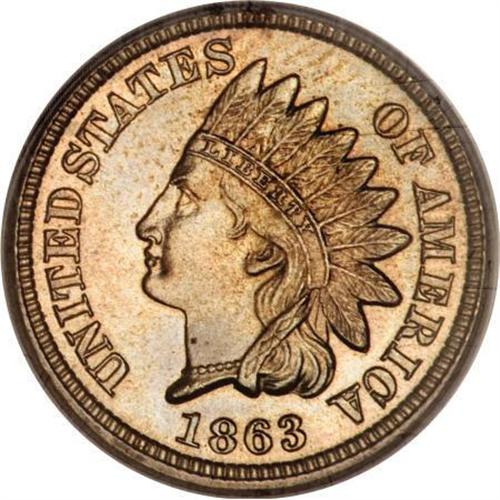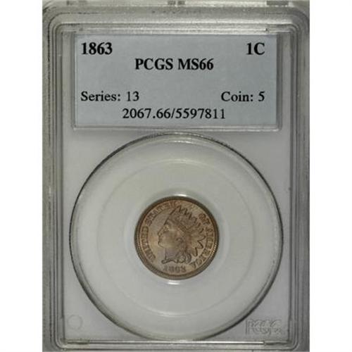 <B>1863 1C MS66 PCGS.</B></I> While the heavily minted 1863 cent is a popular choice for many type collectors, the weak strikes that are prevalent for the issue can dissuade certain numismatists. While the tips of the feathers are a touch soft, the overall detail of this lilac-accented copper-gold piece is significantly above-average. Excellent eye appeal, as demanded of the grade. Census: 16 in 66, 0 finer (3/08).<BR><BR><B>Coin Engraver:</B> James B. Longacre<BR><BR><b>Shipping:</b> Coins & Currency (<a target="_blank" href="http://www.heritageauctions.com/common/shipping.php">view shipping information</a>)