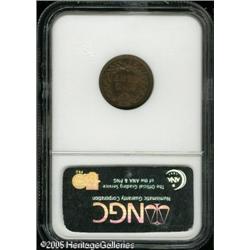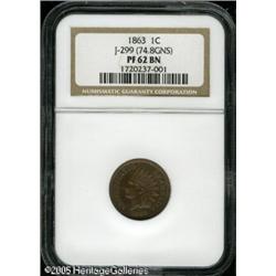 <B>1863 1C One Cent, Judd-299, Pollock-359, R.3, PR62 Brown NGC.</B></I> Regular die trials issue on both sides, but the reverse differs in that has medallic orientation (180 degree alignment). Struck in copper with a reeded edge. Rich chocolate-brown coloration is seen overall with undertones of olive-green. The obverse is noticeably marked and hairlined which explains the grade. Lot:9834