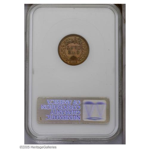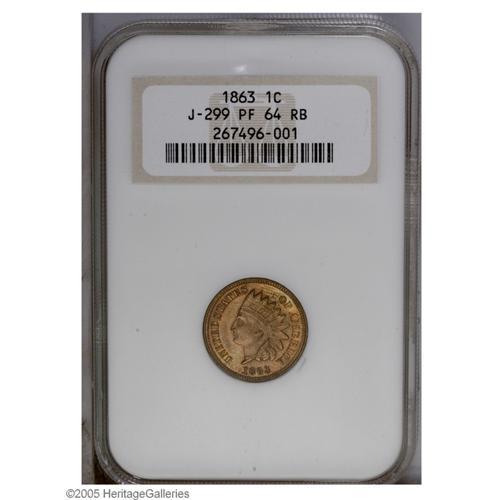 <B>1863<1C> One Cent, Judd-299, Pollock-359, R.3, PR64 Red and Brown NGC.</B></I> Snow-PT1. Struck from regular issue One Cent dies, but with bronze alloy used instead of the then current copper-nickel composition. The bronze alloy, of course, was introduced into circulation in 1864, which makes this pattern a transitional issue. Pollock lists four variants, all from the same dies, based upon the thickness of the planchet and the die alignment. While the thickness of the coin cannot be determined due to the encapsulation, this specimen has medal turn, 180 degrees from normal U.S. coin alignment. An intricately struck near-Gem with pleasing orange-red and aqua tints, exemplary aside from a trace of carbon above the headdress.