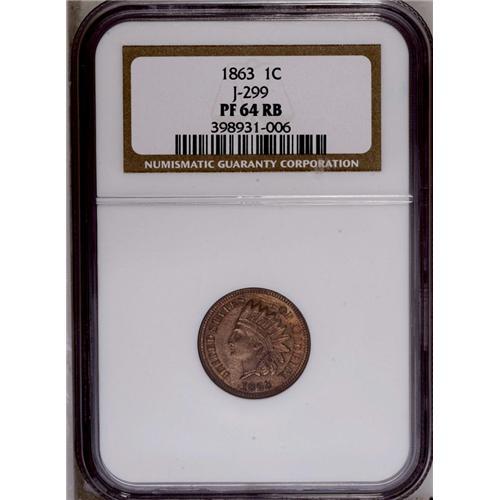 <B>1863<1C> One Cent, Judd-299, Pollock-359, R.3, PR64 Red and Brown NGC.</B></I> Snow-PT1. Medal alignment. From regular issue dies, but struck in bronze with a plain edge. A transitional pattern for the 1864 bronze No L regular issue. Lime and rose hues visit the slightly mellowed tan-gold surfaces. Well struck and unabraded with a faint fingerprint fragment at 1 o'clock.