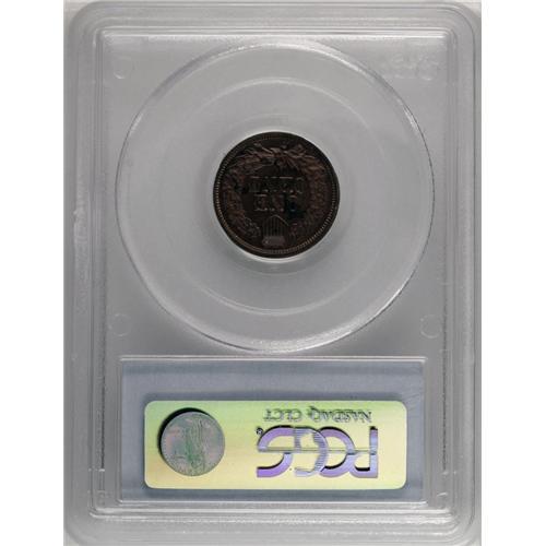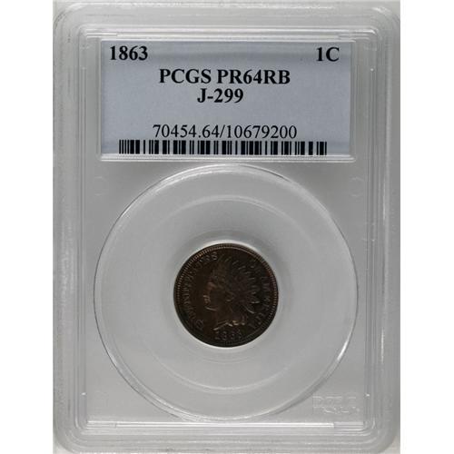 <B>1863<1C> One Cent, Judd-299, Pollock-359, R.3, PR64 Red and Brown PCGS.</B></I> Ex: John L. Harris Collection. Snow-PT1. Struck from regular issue one cent dies, but with bronze alloy used instead of the then current copper-nickel composition. The bronze alloy, of course, was introduced into circulation in 1864, which makes this pattern a transitional issue. Pollock lists four variants, all from the same dies, based upon the thickness of the planchet and the die alignment. While the thickness of the coin cannot be determined due to the encapsulation, this specimen has medal turn, 180 degrees from normal U.S. coin alignment. An intricately struck near-Gem with pleasing orange-red and purple-blue tints, exemplary aside from some splotchy dark color on the reverse.<BR><I>Ex: John L. Harris Collection (Stack's, 11/50), lot 67.</B></I><BR><I>From The Redfjord Collection.</B></I>