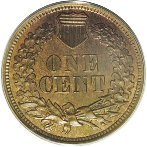 <B>1863<1C> One Cent, Judd-299, Pollock-359, R.3, PR65 Red and Brown PCGS.</B></I> Snow-PT1. An experimental piece struck from the regular dies but without the L on the ribbon. Struck in bronze with a plain edge and medallic alignment. Thick raised striations are noted on the portrait and between the vertical shield lines. Mirrored fields sparkle at most angles, some deep purple and dark-green patina has settled over the Gem quality surfaces. Population: 19 in 65, 2 finer (5/06).