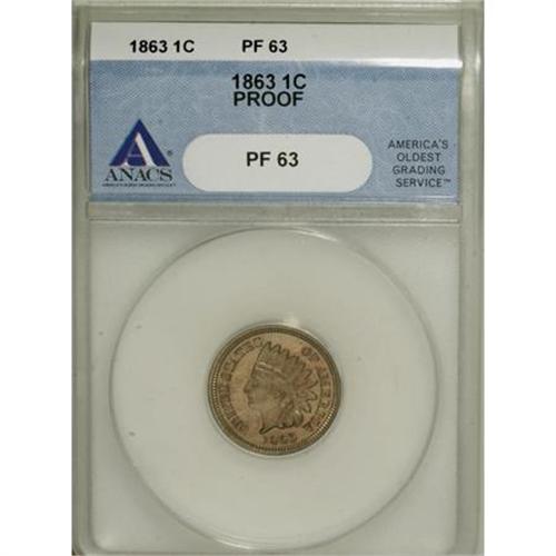 <B>1863 1C PR63 ANACS.</B></I> A mintage of 460 proof cents were reported in 1863. The parallel vertical die lines in front of the eye and the tiny lump below I in LIB on the edge of the ribbon confirm the proof status of this Select example (per Richard Snow's <I>Flying Eagle and Indian Cent Attribution Guide</B></I>, 2nd Edition, Volume 2, 1859-1869). All design elements are sharp, and golden-tan surfaces display good field-motif contrast, especially on the reverse. Some light obverse flecks and handling marks define the grade.<BR><BR><B>Coin Engraver:</B> James B. Longacre<BR><BR><b>Shipping:</b> Coins & Currency (<a target="_blank" href="http://www.heritageauctions.com/common/shipping.php">view shipping information</a>)