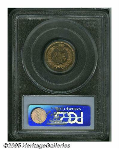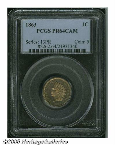 <B>1863<1C> PR64 Cameo PCGS.</B></I> The design features are sharply struck, including virtually full definition on the four diamonds. Attractive golden-tan patina is enhanced by the pronounced cameo over either side. A few small flecks limit the grade. Population: 13 in 64, 16 finer (5/05).