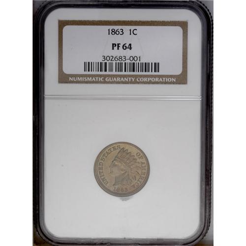 <B>1863<1C> PR64 NGC.</B></I> Steel-blue and coppery peach coloration is attractively distributed over the two sides of this crisply struck near-Gem. Some dark verdigris is noted on the upper left portion of the N in CENT, but both sides of the piece seem virtually carbon-free and distraction-free otherwise. A Choice example from a minuscule proof mintage of 460 pieces. Census: 46 in 64, 33 finer (1/06).