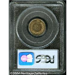<B>1863<1C> PR64 PCGS.</B></I> This Choice Proof Indian cent is sharply struck and has lightly reflective tan surfaces. A trace of iridescent toning on each side adds to the appeal. A few small spots on each side keep this from the Gem category. <BR><BR><B>Important notice:</B> Heritage usually auctions material at the rate of 200-250 lots per hour. On some occasions eBay Live bid software or the Internet may not be able to keep up with the pace of the auction. We recommend placing a realistic absentee bid now as insurance to avoid disappointment. Occasionally the auctioneer may eliminate or reject an eBay Live bid, and the auctioneer may also reopen a lot after the close of the eBay live bidding (usually because we missed an audience bid), and may reject your bid even if it shows you as the winning bidder. By bidding via eBay Live, you agree that Heritage may award the lot to another bidder at its sole discretion under the circumstances described above or any other reasonable circumstances. Since eBay bids are not shown to us until we open the lot on the floor, we treat those bids just like floor bids. In most cases the floor responds before the eBay bid is presented to us, due to Internet lag time, so for consistency we have made it a policy that floor bids are always considered first over tie eBay live bids. Also please note that all Heritage lots purchased through eBay Live carry a 20% Buyer's Premium. Please make sure you read the Terms and Conditions before you bid.