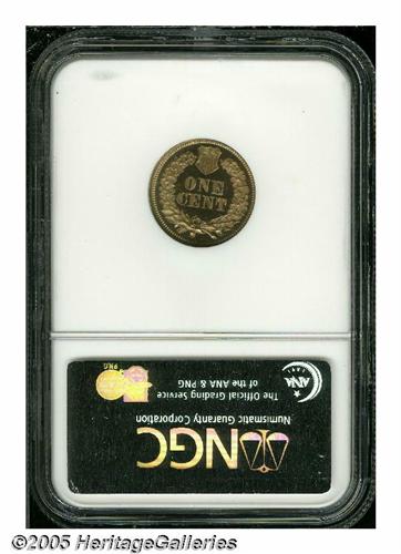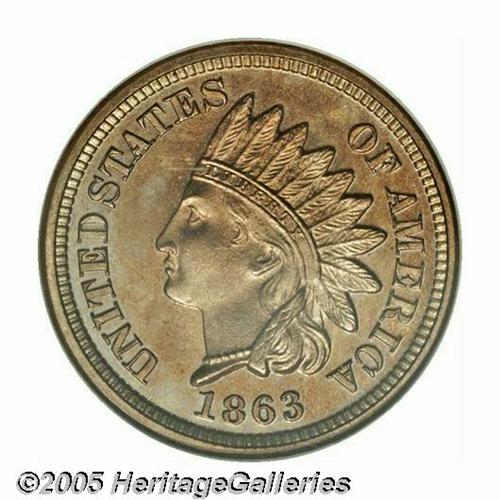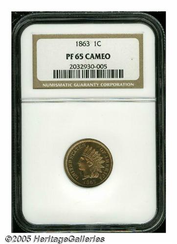 <B>1863<1C> PR65 Cameo NGC.</B></I> The 460 proof 1863 proof that were produced are from a single die pairing, and it is reliably estimated that today no more than 150 pieces have survived in all grades. This example is tied with several others at the second finest certified tier with a total of 12 pieces certified by the major services. This is a beautiful proof striking that shows full "white" coloration on the reverse, with light tinges of orange and lilac on the obverse. A premium example of this scarcer copper-nickel proof.<BR><I>From The Clifford Columbus Collection.</B></I>