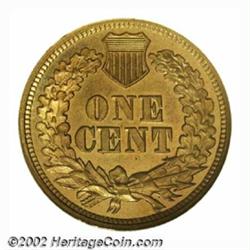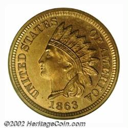1863 1C PR65 NGC. The Mint's output of proof Indian Cents in 1863 totaled (approximately) 460 pieces, of which no more than 150 coins are believed extant (per Rick Snow, 1992). An obviously scarce issue, the 1863 is particularly elusive in grades above the PR64 level. Fully struck with warm, original, orange-tan color, the surfaces reveal shimmering reflectivity as the coin turns into the light. Neither side, however, exhibits a noteworthy blemish. Population: 30 in 65, with a mere six finer (7/02). Important notice: We expect to be auctioning lots at the rate of 200-250 per hour. Sometimes eBay Premier live bid software cannot keep up with that pace, so we strongly recommend that you place a realistic proxy bid now as insurance to avoid disappointment. Also please note that all Heritage/CAA lots purchased through eBay Premier carry a 20% Buyer's Premium. Please make sure you read the Terms and Conditions.