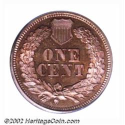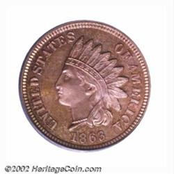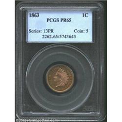 1863 1C PR65 PCGS. Slanting die lines (as produced) immediately in front of Liberty's eye are diagnostic of the proof 1863 Indian Cent. One of two Gem quality representatives of this scarce Civil War era proof in this sale, this is a remarkably colorful Gem. Mottled pastel-lilac and orange-apricot undertones peer through generally even, honey-brown shadings. Direct angles also reveal modest reflectivity in the fields, but the powerfully impressed devices and virtually pristine features are evident even after the most casual observation. We last offered a PCGS-certified survivor of this issue as lot 5316 in our June 2002 sale of the Dr. Gary Lattimer Collection. Bidding on that coin reached $3,000. Important notice: We expect to be auctioning lots at the rate of 200-250 per hour. Sometimes eBay Premier live bid software cannot keep up with that pace, so we strongly recommend that you place a realistic proxy bid now as insurance to avoid disappointment. Also please note that all Heritage/CAA lots purchased through eBay Premier carry a 20% Buyer's Premium. Please make sure you read the Terms and Conditions.