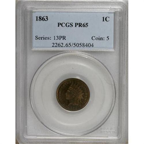 <B>1863 1C PR65 PCGS.</B></I> It is estimated that 460 or so proof cents were struck in 1863. Relatively few apparently survived in PR65 and finer levels of preservation, at least according to certified population/census figures. Razor-sharp definition shows on the design features of this well preserved specimen. Both sides are bathed in orange-tan patina, with a good amount of field-motif contrast, especially when the coin is rotated under a light source. Population: 24 in 65, 7 finer (6/07).<BR><BR><b>Shipping:</b> Coins & Currency (<a target="_blank" href="http://www.heritageauctions.com/common/shipping.php">view shipping information</a>)