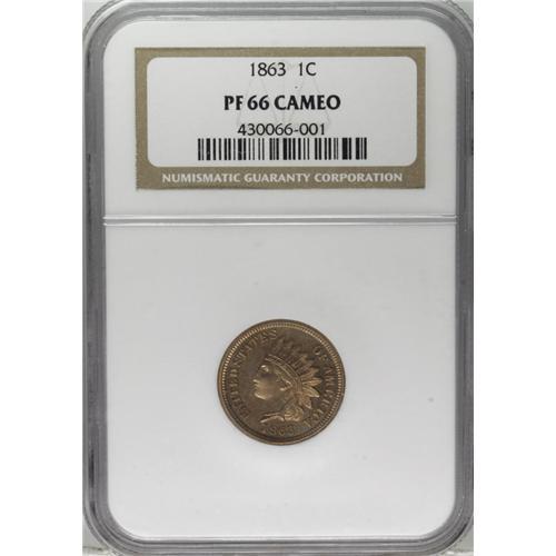 <B>1863 1C PR66 Cameo NGC.</B></I> A gleaming straw-orange example that has a blush of rose on the cheek. The obverse displays significant contrast, and that on the reverse is even stronger. An attractive and pleasing representative of this Civil War issue, one of an estimated 460 specimens coined. Census: 5 in 66 Cameo, 2 finer (12/06).<BR><BR><b>Shipping:</b> Coin/Currency (<a target="_blank" href="http://www.heritageauctions.com/common/shipping.php">view shipping information</a>)