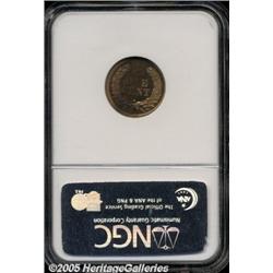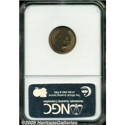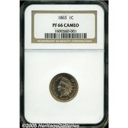 <B>1863 1C PR66 Cameo NGC.</B></I> During the Civil War, the Mint was producing Indian cents out of a composition consisting of 88% copper and 12% nickel, the same composition that had been in use since the first small cents were produced in 1856. During this time, these were simply called nickel cents or nickels, not because of the denomination, but because of the composition. In the next year, the composition was changed to bronze, a much easier alloy to work with. This Gem Proof is sharply struck with full details on both sides. Even the diamonds on the ribbon are complete, and all of the feathers are fully delineated right to their very tips. Neat raised vertical die lines are visible directly in front of the Indian's eye, almost as if she is wearing an eyepiece. Attractive cameo devices are surrounded by reflective fields, and the entire coin has pleasing pinkish-red coloration. A few splashes of iridescent toning are present on the obverse, with a band of lilac and blue on the reverse. Take a close look at this one. Population: 4 in 66, 2 finer (2/05).