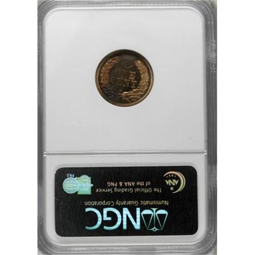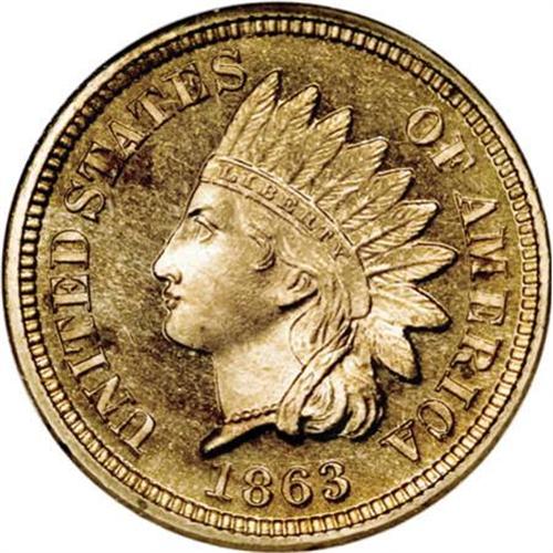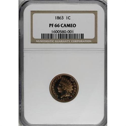 <B>1863 1C PR66 Cameo NGC.</B></I> During the Civil War, the Mint was producing Indian cents out of a composition consisting of 88% copper and 12% nickel, the same composition that had been in use since the first small cents were produced in 1856. During this time, these were simply called nickel cents or nickels, not because of the denomination, but because of the composition. In the next year, the composition was transitioned to bronze, a much easier alloy to work with. This high quality proof is sharply struck right down to the diamonds on the ribbon. Raised vertical die lines are visible directly in front of the Indian's eye. Attractive cameo devices are surrounded by reflective fields, and the entire coin has pleasing pinkish-red coloration. A few splashes of iridescent toning are present on the obverse, with a band of lilac and blue on the reverse. Census: 5 in 66 Cameo, 2 finer (6/07).<BR><I>From The Santa Fe Collection.</B></I><BR><BR><b>Shipping:</b> Coins & Currency (<a target="_blank" href="http://www.heritageauctions.com/common/shipping.php">view shipping information</a>\)