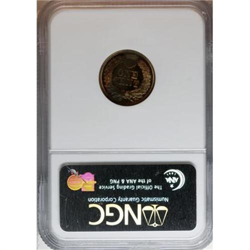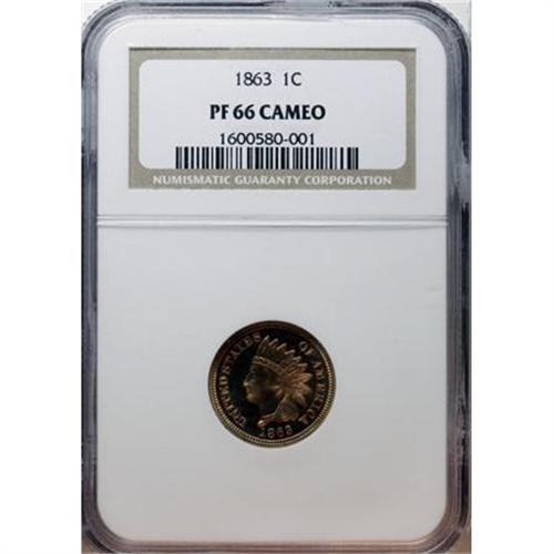 <B>1863 1C PR66 Cameo NGC.</B></I> During the Civil War, the Mint was producing Indian cents out of a composition consisting of 88% copper and 12% nickel, the same composition that had been in use since the first small cents were produced in 1856. During this time, these were simply called nickel cents or nickels, not because of the denomination, but because of the composition. In the next year, the composition was transitioned to bronze, a much easier alloy to work with. This high quality proof is sharply struck right down to the diamonds on the ribbon. Raised vertical die lines are visible directly in front of the Indian's eye. Attractive cameo devices are surrounded by reflective fields, and the entire coin has pleasing pinkish-red coloration. A few splashes of iridescent toning are present on the obverse, with a band of lilac and blue on the reverse. Census: 5 in 66 Cameo, 2 finer (11/07).<BR><I>From The Santa Fe Collection, Part Two.</B></I><BR><BR><b>Shipping:</b> Coins & Currency (<a target="_blank" href="http://www.heritageauctions.com/common/shipping.php">view shipping information</a>)