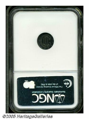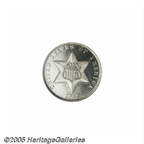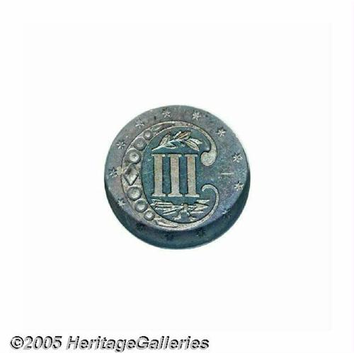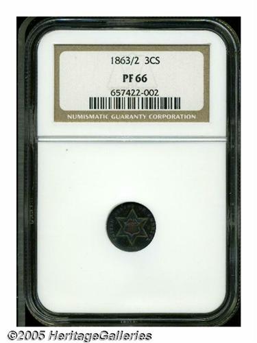 <B>1863/2<3CS> PR66 NGC.</B></I> Rather vividly toned in jade-green and violet hues. The 1863/2 is a seldom offered proof overdate, with this specimen being among the finest in existence. Population: 4 in 66, 0 finer (6/05).
