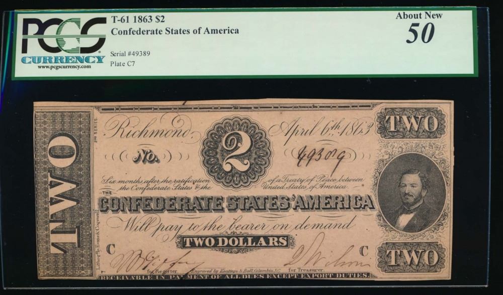 One 1863 $2 Confederate States of America Note PCGS 50.