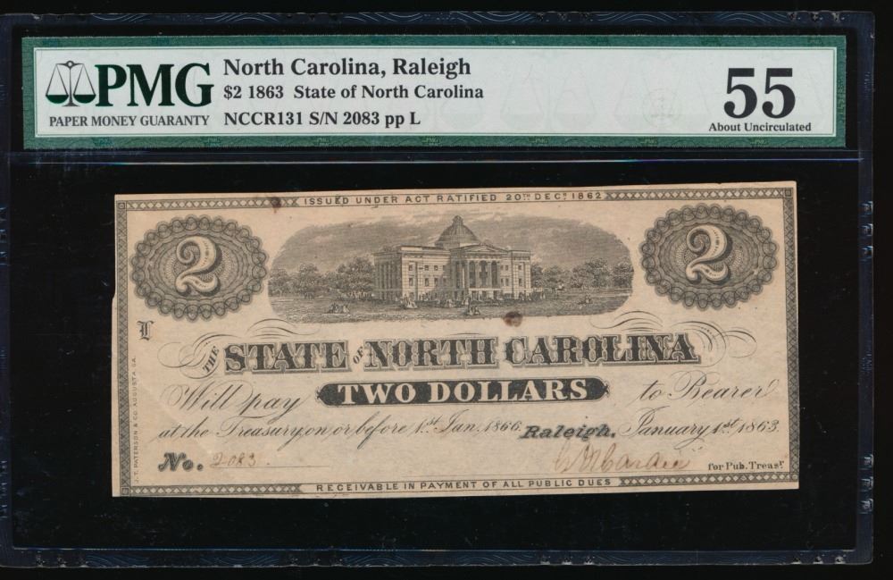 One 1863 $2 North Carolina Obsolete Note PMG 55.