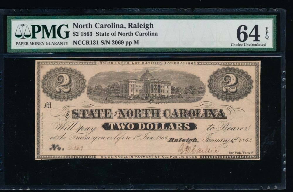 One 1863 $2 North Carolina Obsolete Note PMG 64EPQ.