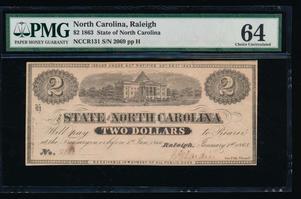 One 1863 $2 North Carolina Obsolete Note PMG 64.