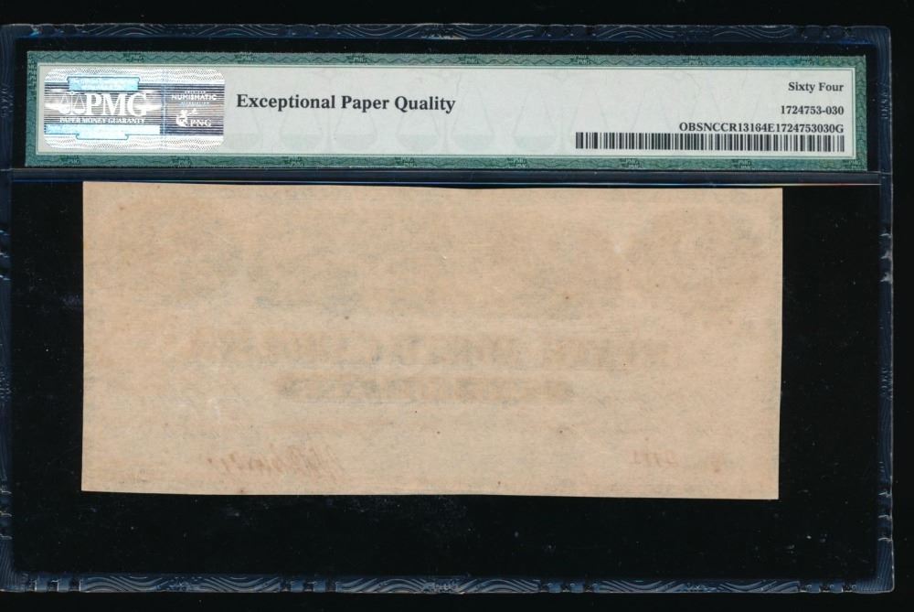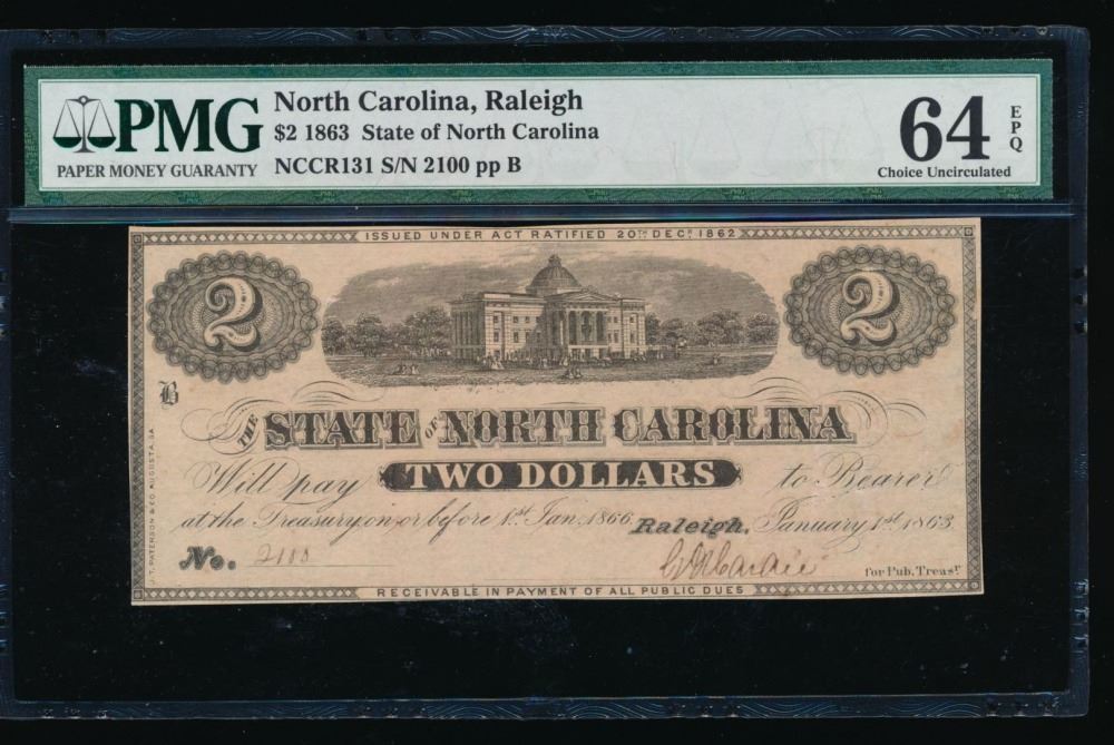 One 1863 $2 Raleigh NC Obsolete Note PMG 64EPQ.