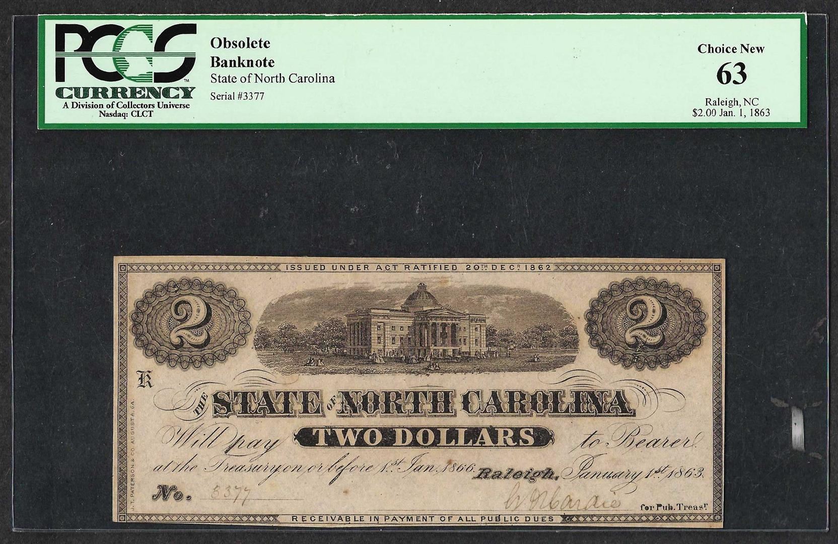 One 1863 $2 State of North Carolina Obsolete Bank Note PCGS Choice New 63. PCGS Graded.