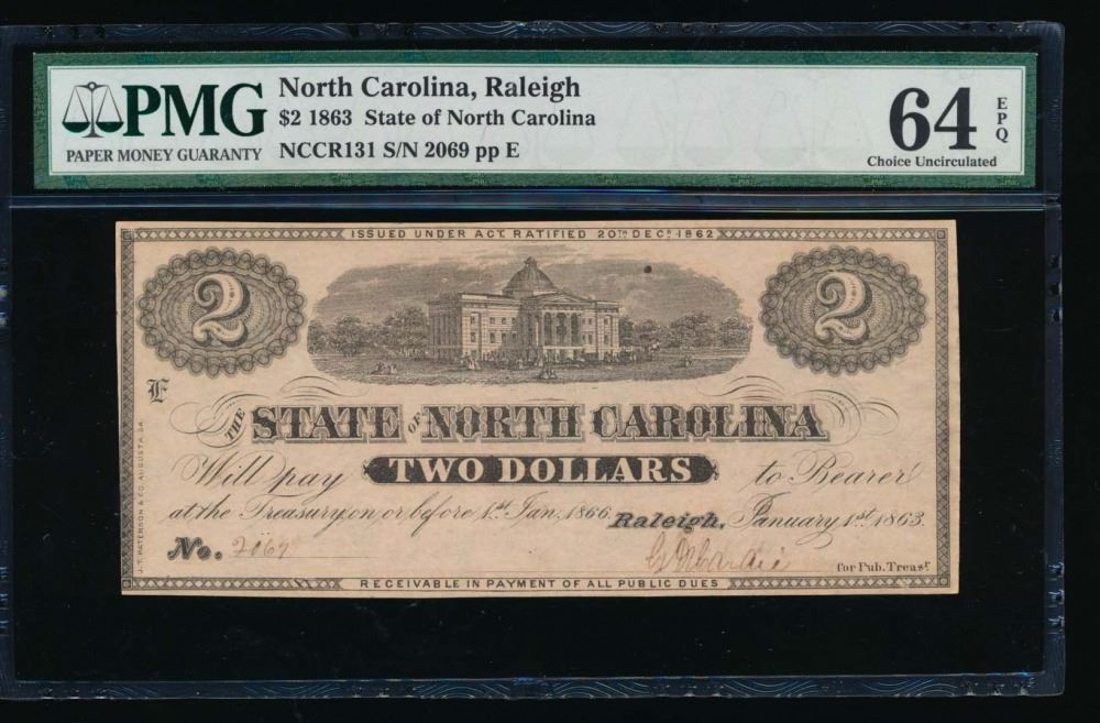 One 1863 $2 State of North Carolina Obsolete note PMG 64EPQ.