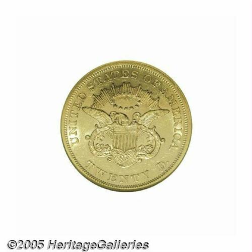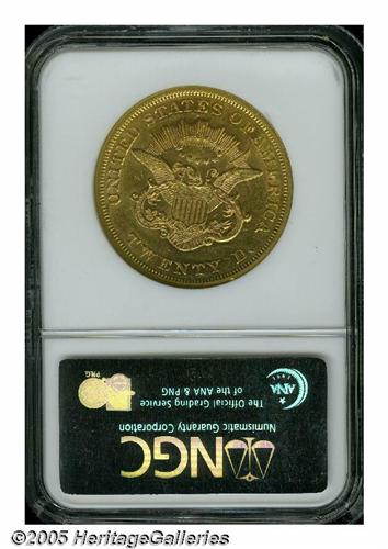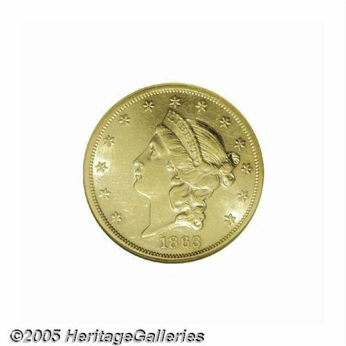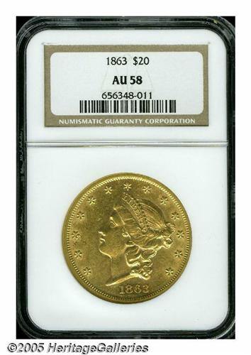 <B>1863<$20> AU58 NGC.</B></I> Well defined save for a bit of striking softness on Liberty's highest curls. There are few appreciable surface marks on the obverse while only minor abrasions can be seen on the left side of the reverse. The 1863 is among the scarcest P-mint Twenties of its type and even boasts a high ranking for the entire Type One design, regardless of mintmark. Population: 22 in 58, 4 finer (6/05).