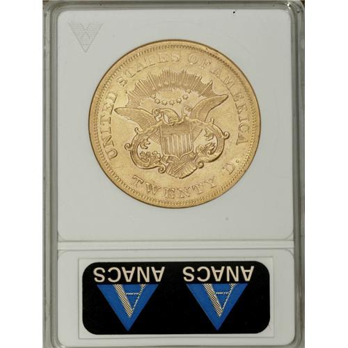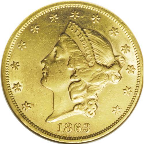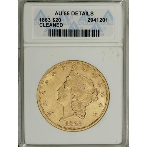 <B>1863 $20 --Cleaned--ANACS. AU55 Details.</B></I> During the Civil War year of 1863, mintages of all gold coin denominations were low, and no quarter eagles at all were produced. Double eagles of the year are scarce in any grade. The present piece offers brilliant luster over rich, orange-gold surfaces, and evidence of cleaning is slight, despite ANACS' pronouncement. An appealing piece.<BR><BR><b>Shipping:</b> Coins & Currency (<a target="_blank" href="http://www.heritageauctions.com/common/shipping.php">view shipping information</a>)