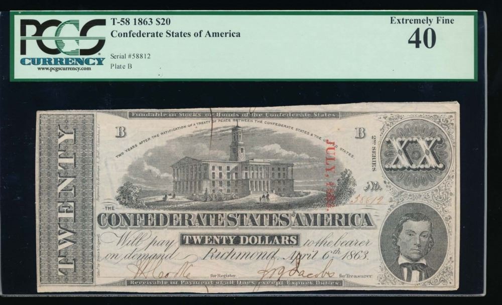 One 1863 $20 Confederate States of America Note PCGS 40.