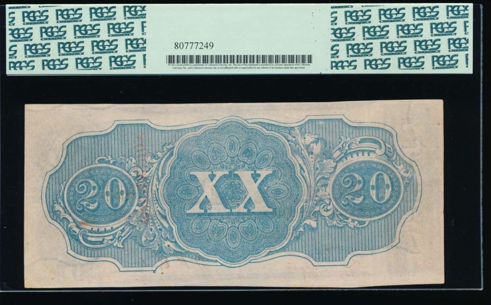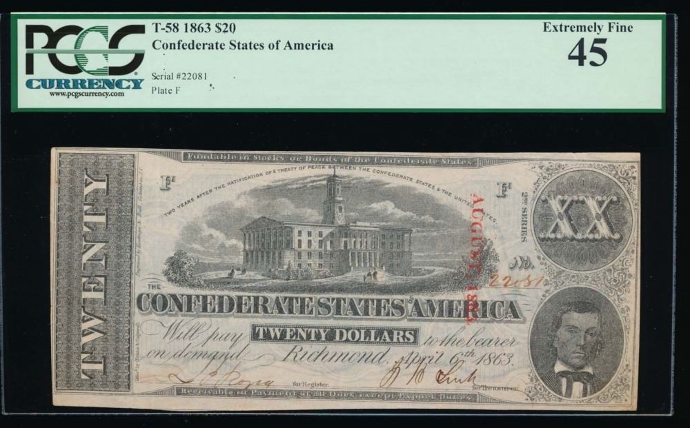 One 1863 $20 Confederate States of America Note PCGS 45.