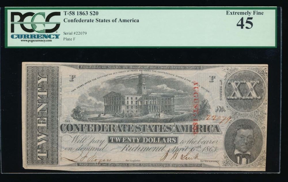 One 1863 $20 Confederate States of America Note PCGS 45.